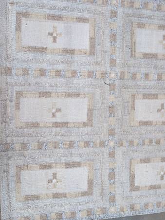 This is a Scandinavian flat-weave rug with geometric patterns in white and beige. Rug & Kilim's Scandinavian Beautiful hallway rug. Came out of high end home. Looks like new. No pets no stains....