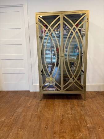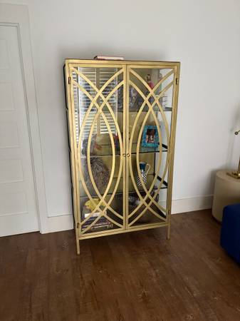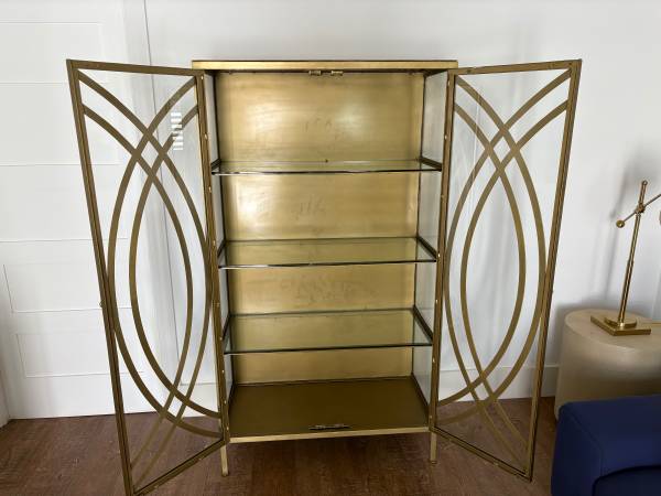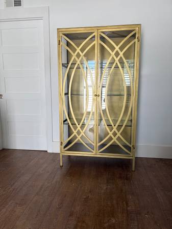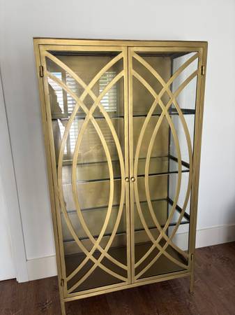 Beautiful and unique Display/Curio cabinet. Gold metal and glass. Very artsy. 3 glass shelves that can be removed but are “fixed” at 14&1/2”s apart. Plus metal bottom for added display.