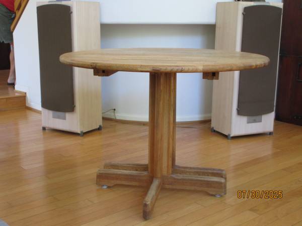 Beautiful solid oak butcher block table with center leaf and pedestal base. You can use it to seat 4 (42" diameter) or 6 (60" length) with the leaf installed. This is amazingly heavy and durable- it will easily last 100 years. Top is 1.25 inches thick and sits 29 inches high. The pedestal base allows easier seating. Very good condition. Asking $120/OBO.