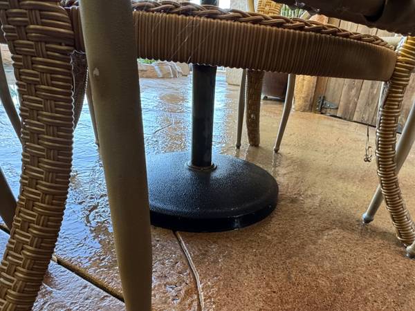 Selling a beautiful 5-piece wicker dining table set. This classic table includes a 48-inch round table with a glass top, four matching chairs, a patio umbrella, and a heavy-duty metal umbrella base.
