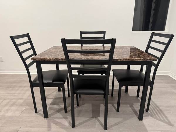 Dining Table: The table top has a uniform, glossy marble pattern. The table top is easy to maintain as it is easy to clean, waterproof, and oil-resistant.