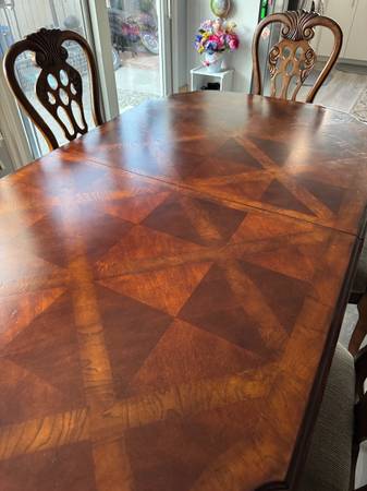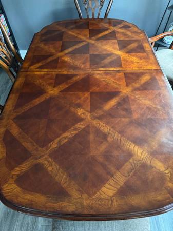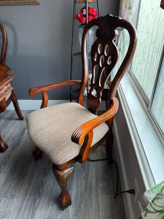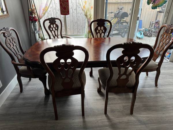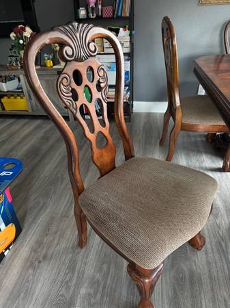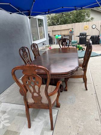 Dining room set. Table, leaf and six chairs. Table is 74” long x 43” wide. Leaf is 18” wide. Two arm chairs and four chairs with high backs. Breaks apart for easy loading and hauling. You will need...