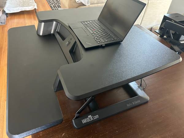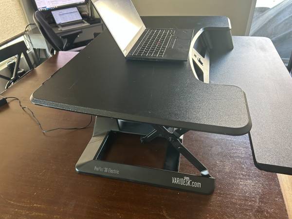 VariDesk Pro Plus 36 Electric Adjustable Standing Desk Converter. Black. Powered vertical lift, Dual monitor compatible, 36” wide surface and keyboard tray , 6” up to 19” inch height range. Made of durable materials. some dings and scratches. More than one available. $80.00. Thanks for looking