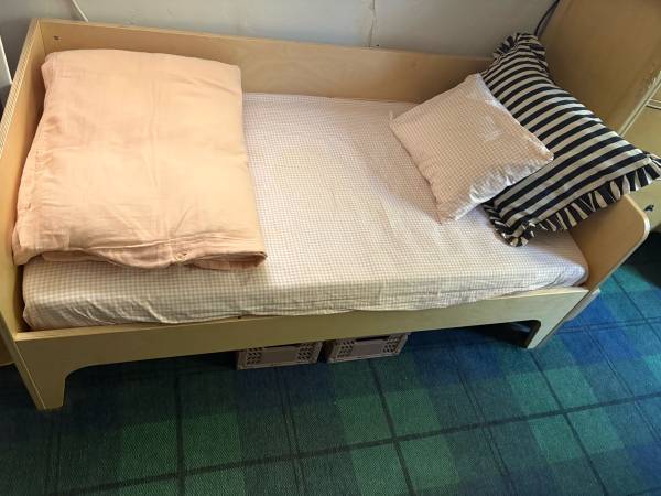 OEUF - PERCH TODDLER BED Regular price $620.00 COLOR — White/Birch This item is GREENGUARD Gold Certified. Dimensions: 53.5" L x 29.5" W x 21" H Condition: Like new Mattress and bedding additional...