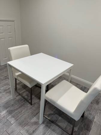 Incredibly clean. Must pickup. Table: 29.5x29.5 inches / 29 inches high Chairs: Seat - 18 / Back - 35 inches high