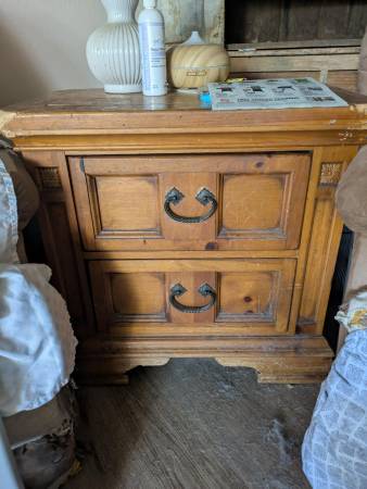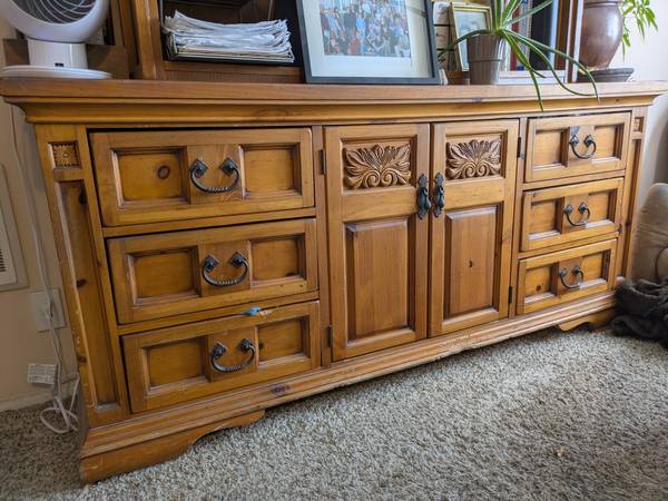Pictures show our puppy chewed the sides of the end tables and a little of the dresser at the bottom. The hutch was not touched.