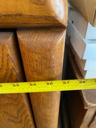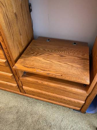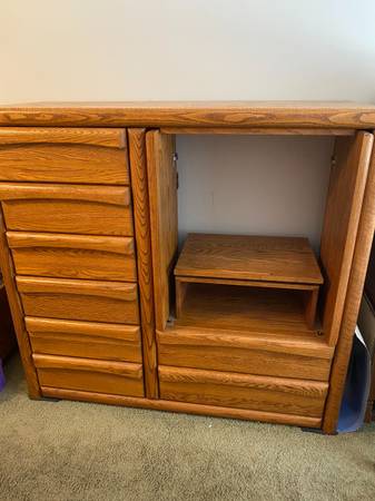 Vintage Retro Modern Mid Century Styling Solid Oak Dresser, Chest of Drawers, TV Armoire, Cabinet and Pull-Out Shelf. Metal roller slides on drawers. Drawers are deep and wide. Made from solid wood. Medium Brown Finish. 4th picture shows a plug outlet for a TV. See pics for measurements. Lots of storage in this dresser chest of drawers.