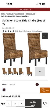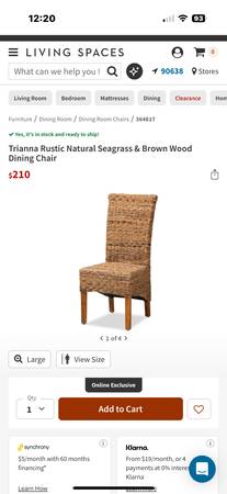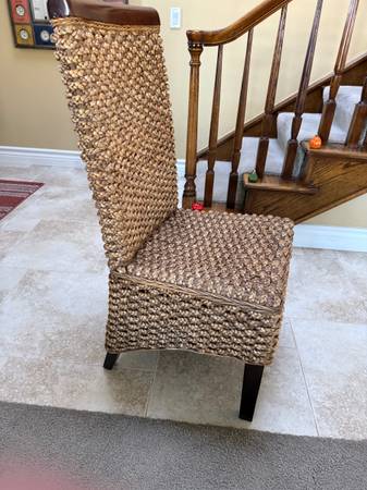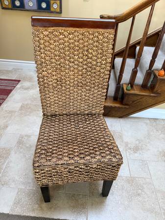 Either sell all 8 together or 6 together or 2. These were originally sold by by world market. They are extremely solid and durable. After many years we are going a different route. Real seagrass not wicker. Solid wood top edge and legs. I’ve included photos of others I’ve seen for sale that aren’t of the same quality as ours. These are beautiful and hard to find. $550for the set of 8.