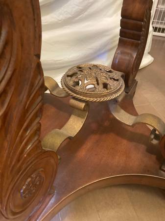Beautiful glass top table. Medallion in center bottom, four carved legs/ supports. Very sturdy, and useful. Seats 4-6 comfortably. Medium brown wood, versatile and stylish. Thick beveled glass. Was...