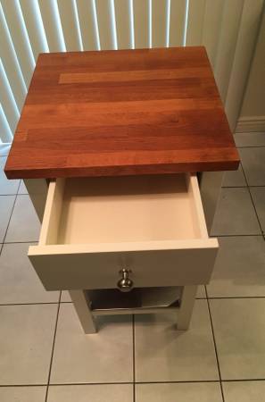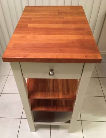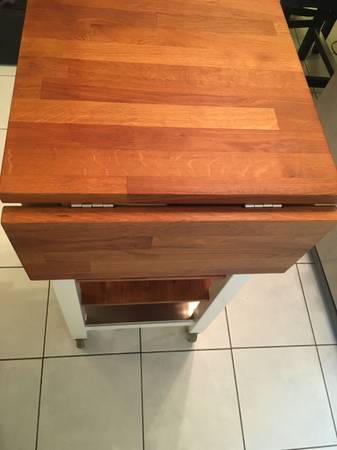 Selling an Ikea Stenstorp Kitchen Island/Trolley with a butcher block top in like new condition for only $60. This has an extended leaf top which adds 8" length to the back and 2 adjustable height solid wood shelves, and wheels on one side so it can be rolled. Bottom shelf is stainless steel. The butcher block top and wood shelves have been regularly oiled and never used for cutting so they are in perfect condition.