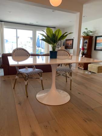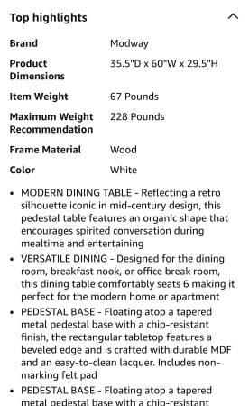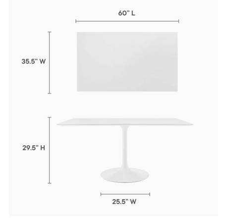 Let modern inspiration flow while gathered around the Lippa 60" Rectangular Dining Table. Perfect for entertaining family and friends or everyday dining, this pedestal table comfortably seats six. Its rectangular tabletop is crafted with MDF with a high gloss finish and beveled edge for a contemporary yet timeless design. Embodying an iconic mid-century silhouette, this pedestal dining table floats on a sleek tapered metal pedestal base with a chip-resistant lacquered finish. Includes non-marking felt pad to protect flooring.