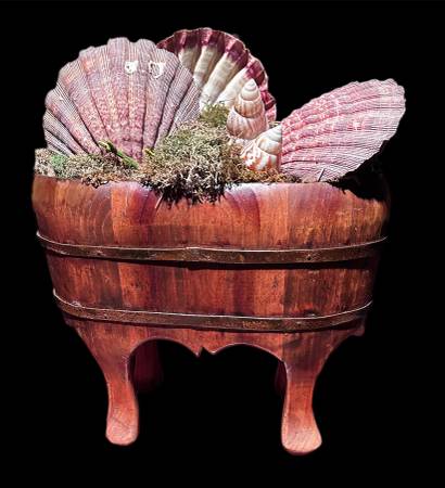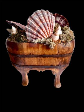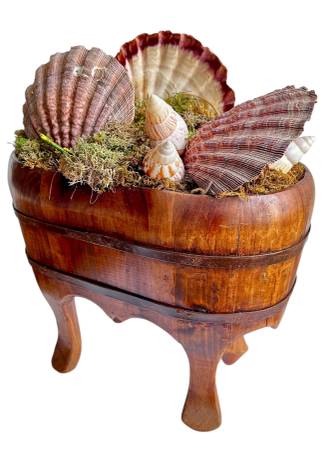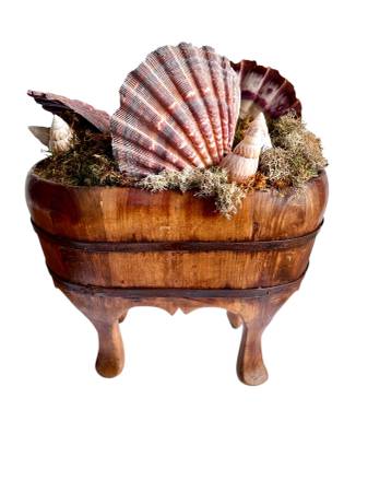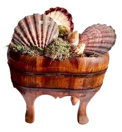 The ancient Chinese compared the human body to a tree with the feet like roots. Daily washing of feet was a ritual for many, prescribed by traditional Chinese medicine to promote blood circulation and dispersal of negative energy. Dated to the mid 20th century, this wooden foot bath charms with timeless rustic appeal. The basin is crafted of wooden planks bound by iron bands and features subtle decorative details such as a scalloped apron and hoofed feet. this provincial basin as a storied place to stow towels, bath accessories, or other household clutter.