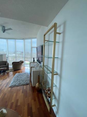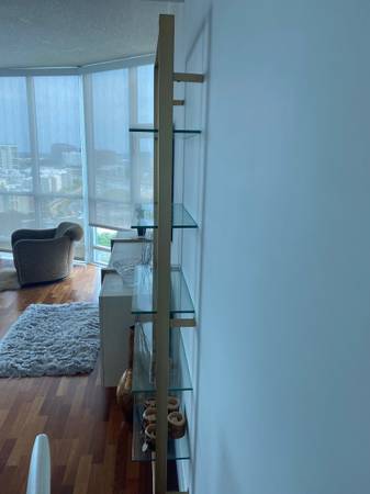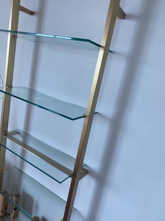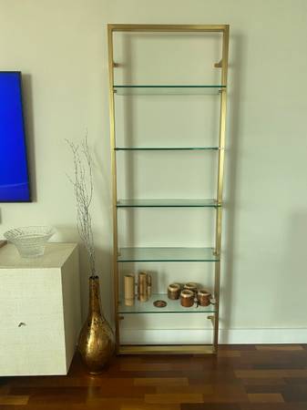 Tesso Brass Metal Wall Mount Bookshelf. Vintage design, sleek, minimalist piece of wall art. Five shelves of tempered glass are fixed to a brushed metal gold frame. Price for new is $499 plus tax and shipping.