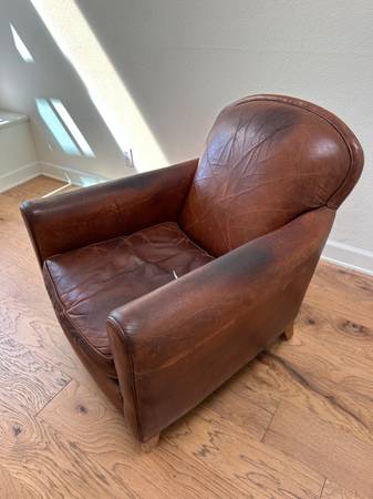 Crate and Barrel full grain leather club chair. Modeled after the gentleman's clubs in England. Small tare in seat (see pic)- comes with small spare piece to patch. Over $2K new. 33" Height x 38"...
