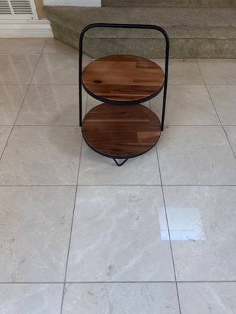 Cute 2 Tier Stand wood and Metal 17x12 Like New Two wooden tiers one large and one smaller w/ metal handle and legs We are cash only because we don't have Zelle.