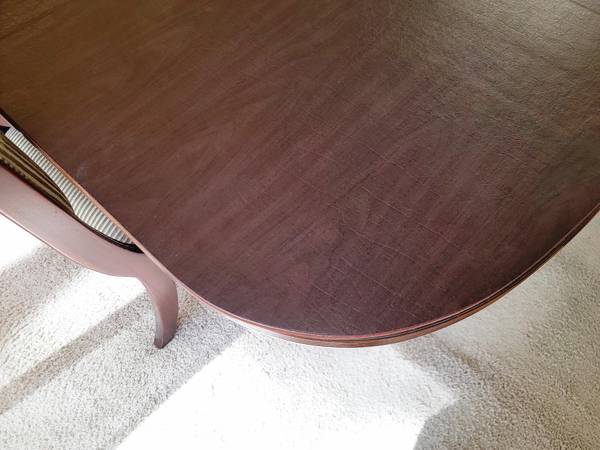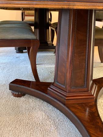 This fine collection of hand crafted, heirloom quality furniture has been gently used and well cared for by my wife and me in a smoke free and pet free home. For most of its life it was positioned in the formal dining room of our air conditioned private residence in Irvine, California, where it was used very lightly (only two or three times per year on special occasions). When we sold our home in 2012, the dining table and chairs were professionally stored in a private, climate controlled warehouse until we moved them to our current apartment home in Irvine, where, due to the lack of an appropriately sized dining area, and our planned move to an even smaller apartment in the near future, we have reluctantly decided to sell them.