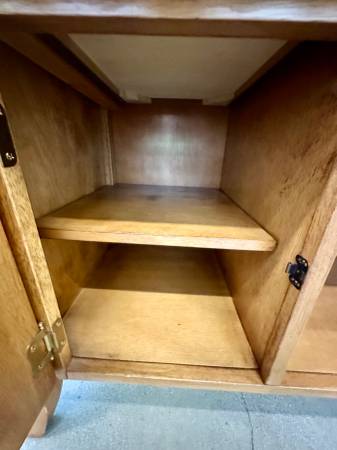 - lower middle has open shelving with light fixture and adjustable shelf - glass shelf not