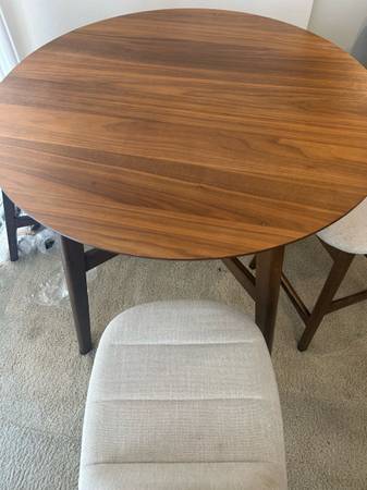 Round dining table with warm walnut wood finish and matching upholstered chairs (neutral light grey fabric). Seats 4 comfortably. Perfect for apartments, kitchens, or smaller dining areas. Solid...