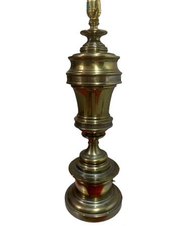 Forged vintage Stiffel brass table lamps. This classic baluster style lamp comes with its original pleated shades.