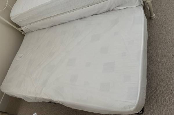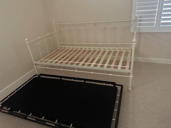 Pottery Barn Savannah Twin Daybed Distressed antique white Comes with trundle mattress ONLY from Pottery Barn Kids All screws are attached at the place they belong when putting it back together....
