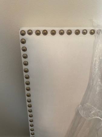 Queen size headboard and mounting rails in excellent condition. Upholstery is soft white washable suede with silver toned nail heads. Priced to sell quickly!!