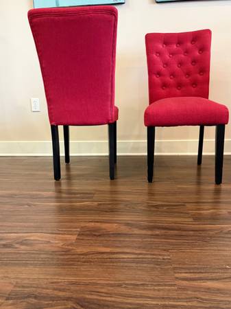 Red linen chairs very clean and comfortable. Dining, desk, living room, etc. Just in time for last minute guests.