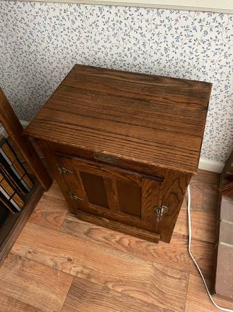 Oak. Simmons hardware, brass. Single door swings out to left. Small scrapes on back, which is not oak. NOTE: not a real ice chest.