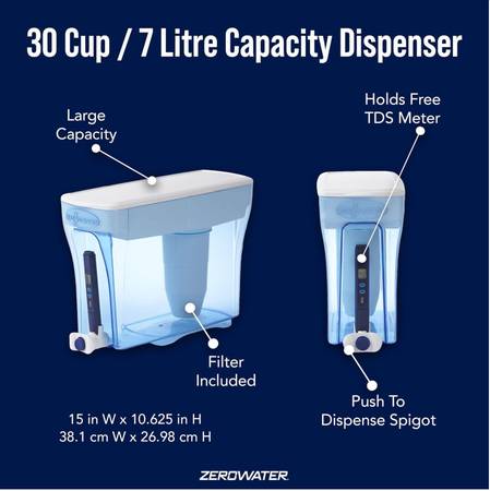 The filter is IAPMO certified to reduce PFOA/PFOS, lead, chromium and mercury. Every water pitcher comes with a free TDS Meter to check the levels of dissolved solids before and after filtering your tap water - to show there is nothing left behind but the purest tasting water. • Filtered Water Dispenser: The 30 Cup 5-stage Water Filtration Dispenser with Ready-Pour technology is the dispenser with a large capacity for filtered water and is perfect for in home or small office usage. • Premium 5 Stage Filtration: Removes 99.6% of total dissolved solids (TDS) for the purest tasting water; TDS are organic and inorganic materials such as pesticides, metals including lead and mercury, minerals, salts, and ions • IAPMO certified and BPA free: The filter is IAPMO certified to reduce PFOA/PFOS, lead, chromium and mercury. All material is BPA free • Including: 30-cup Water Dispenser, 1 ZeroWater Ion Exchange Filter and a Free TDS Meter • Eco-Friendly: Save up to 110 single-use plastic bottles per filter or up to 660 bottles a year while enjoying the purest tasting water
