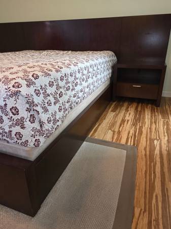 Ethan Allen Queen bedframe, headboard, attached nightstands. Hardwood. High quality, Great condition. Original cost over $2000.(Mattress, boxspring not included) (No delivery available.) 42 1/4" high headboard. 114" headboard width. 65" bedframe width.