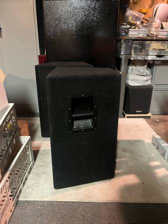 These are great sounding full range PA speakers. I only used them for 5 parties and haven’t touched them in a couple of years. PGM 400watts Max 800watts each. 15” woofer and 1” tweeter.