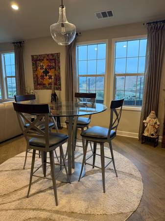 A timeless addition to any home! Originally from Canada, this stylish dining set is perfect for condos or smaller apartments where space is at a premium. The stools feature high backs made of solid, silver-colored powder-coated steel, with leather-like cushions and sophisticated dark wood backrests, seamlessly combining comfort and modern design. The table base is also crafted from solid, silver-colored powder-coated steel, offering both durability and a sleek, contemporary look. This unique set is truly one-of-a-kind—something you won’t find in stores or online. Originally valued at over $2000, it’s now available for just $600. We’re selling it as we’re refreshing our furniture style and color scheme. Cash only terms.