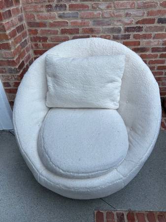 Egg swivel chair in good condition. Selling right now on Living Spaces for $550 see screenshot. Some wear on the cushions - not as fluffy anymore but no damage.