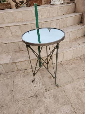 small round metal occasional table with mirror top 26" tall x 17" $125 round brass metal table 29" tall 30" diameter , hoof feet needs some restoration $125