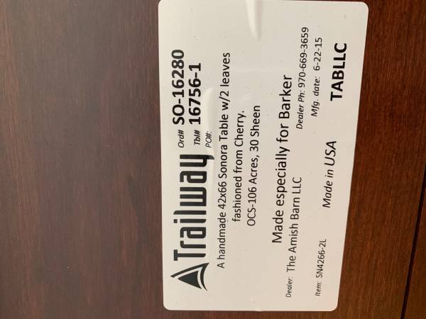 We are selling a beautiful Sonora Amish Cherry table top 42”x66”. Does not include base. The table top has small blemish which is indicated in the photos. Dimensions: 42” X 66” Cash only.