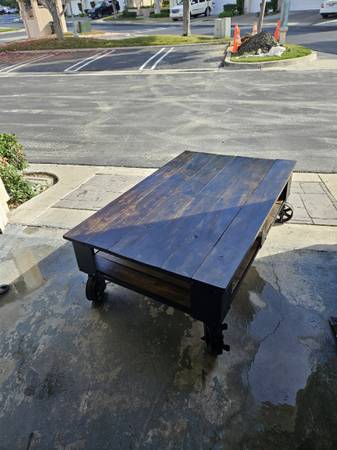Industrial style coffee table with wheels - wood plank top - heavy steel construction - measures 33.5 inches by 53.5 inches and 17 inches high.