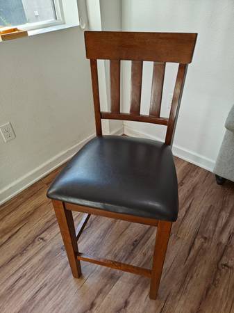 Set of four wooden chairs with cushioned seats from Ashley. Actual Price is 350 for 2. here is the link : https://www.ashleyfurniture.com/p/haddigan_2-piece_bar_stool/APG-D5961242.html