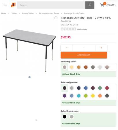 Academia's Rectangle Activity Table is a versatile and durable choice for your classroom. The thick fiberboard core top features a high-pressure laminate surface in your choice of color. Chrome-plated steel leg inserts adjust in one-inch increments from 23" to 31" high and include self-adjusting floor glides. Select from several colors for the PVC edge banding. The Rectangle Activity Table is made in the USA.