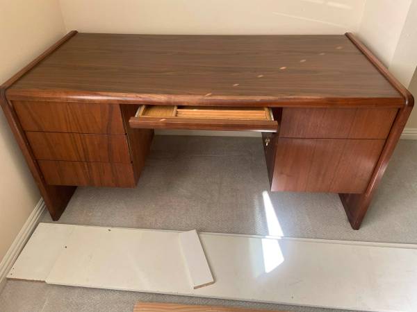 Solid wood desk in good condition. Desk is 60"w x 30"d x 28.5"h. Desk has a total of 6 drawers including a pen/pencil drawer and locking file drawer. All drawers work well, wood could use some stain...