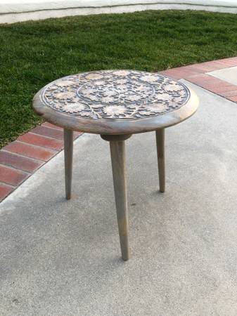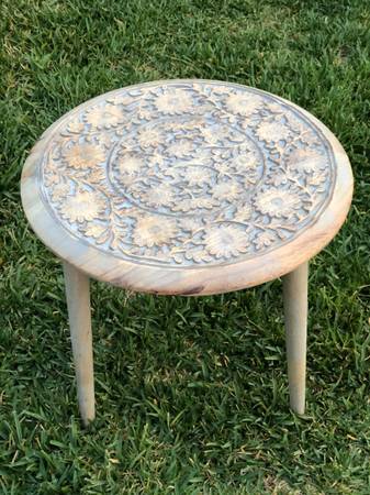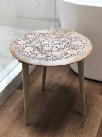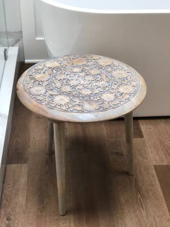 Beautiful carved wood accent table featuring engraved floral design top and 3 splayed legs. About 18" round x 18" tall. Perfect next to a chair or we used it next to a bathtub to hold candles, towels, bath products, etc. Please use the email link or CL chat feature to contact us. Thank you
