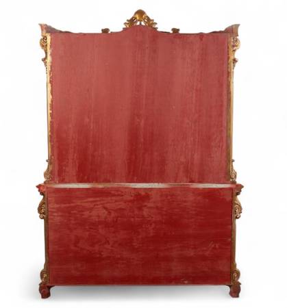 Baroque-inspired giltwood display cabinet with carved details and serpentine curved glass side panels. The cabinet features three upper display sections with glass doors and lower storage cabinets with ornate carved appliqués.