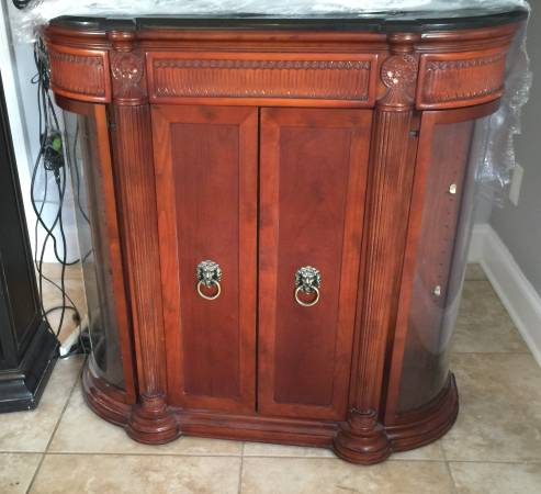 Selling our beautiful mahogany / walnut grained wood and stone buffet table. Great for storing items, displaying objects, or just general decoration. The top is a marble-like stone but since I am not sure if it's actually marble, I am just calling it stone.