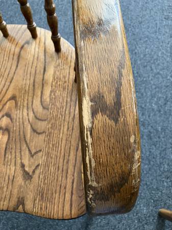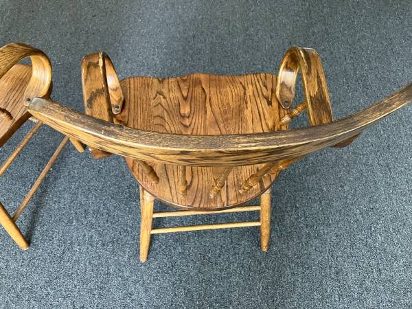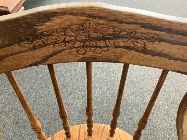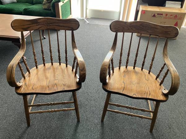 Vintage pair of solid oak dining chairs with floral detailing. Well loved with signs of age and wear. Please see photos for condition and details. You must be able to pick-up and move yourself. If this posting is still up, then they are still available.