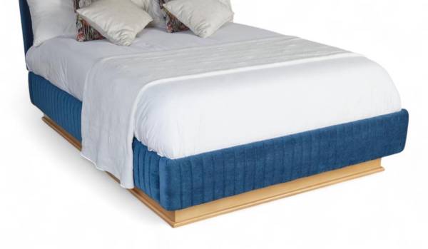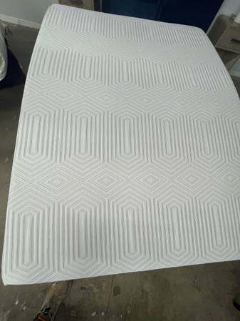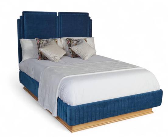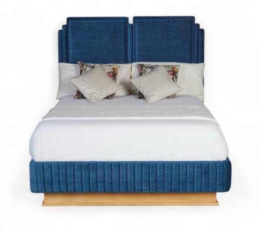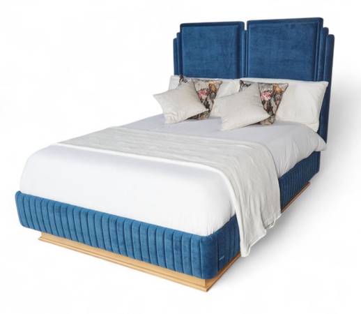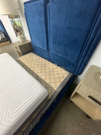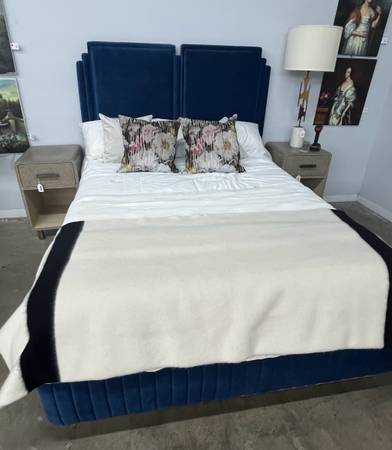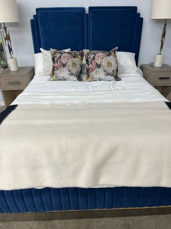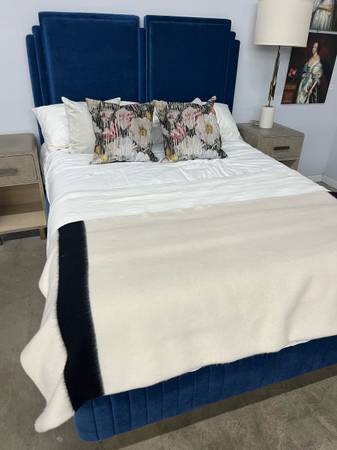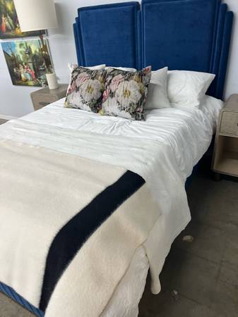 A beautiful queen size upholstered bed with associated mattress, sheets, pillows and bedspread Excellent condition Dimensions: Frame: 61 x 65 x 86 in. (154.9 x 165.1 x 218.4 cm.)