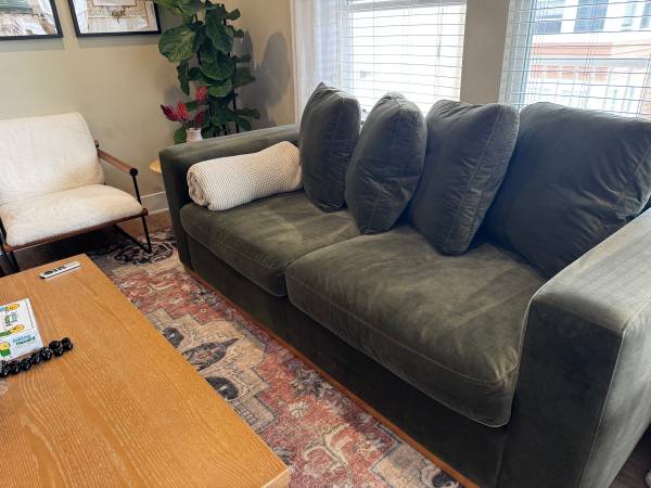 Excellent like new condition west elm 82” Newport modular sofa with throwback pillows. Quality is amazing, deep seating comfort and plush green velvet material with feather pillows, super cozy for movie nights. The size makes it perfect for any small space/apartment living. Purchased in April of this year, nothing wrong with it just upgrading to a larger sofa.