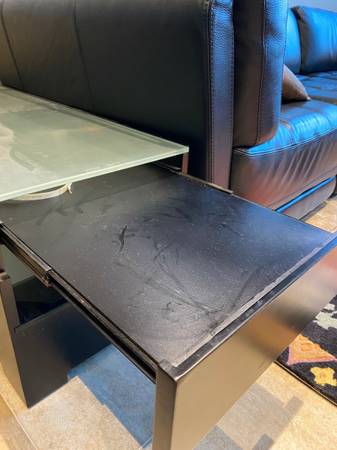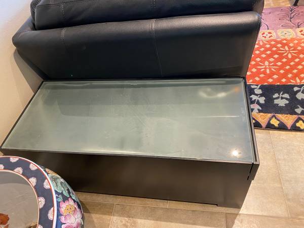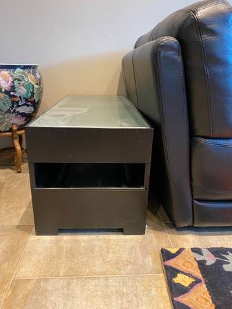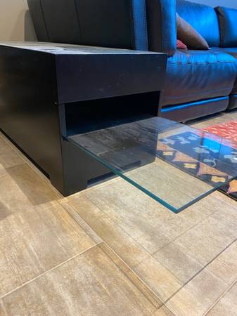 BLACK SIDE TABLE WITH TEMPERED GLASS, SLIDE OUT DRAWER slight nick, secret compartment under lower glass 37 1/2" Long x 15 3/4" wide x 16 1/8" tall Cash only