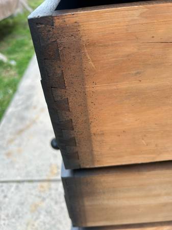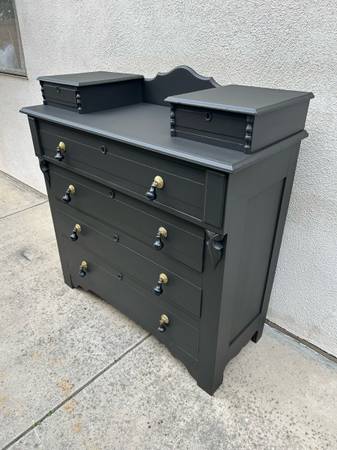 This is a beautiful piece of antique furniture it has very nice handles dovetail drawers and that old wooden charm a beautiful piece to display and the top 2 little drawers have keys to lock them.All nicely wrapped and can deliver local if needed and excellent condition.Measures 43 wide by 44 tall and 19 deep .Costco has small laminate non wood dresser for 1300 get a nice piece of charming history for a third of that cost.If the ad is up we have it in Mission Viejo.We will reply in order to those who leave call back numbers