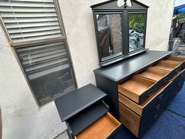 Instead of spending 1300 at Costco for a single small laminate non wood 5 drawer dresser get a high quality complete bedroom 4 pc solid birch bedroom set in excellent condition and can deliver local if needed.Set has dual dovetail drawers and brass handles as well as solid birch a mark of quality and craftsmanship a no brainer on price with delivery option only one buyer will get the deal on this rare set.Dresser is 62 long by 20 deep and 35 tall with 10 drawers.Nightstands are 28 tall by 21.5 wide and 17.5 deep.Unique dual mirror is 41 tall center and 52 wide .If the ad is up we have it in Mission Viejo nicely wrapped in our storage .We will reply to those who leave call back numbers