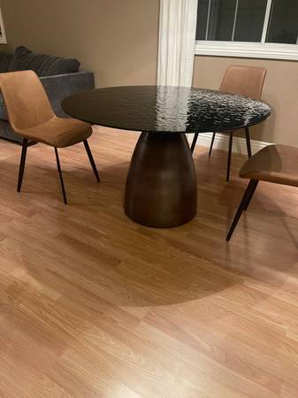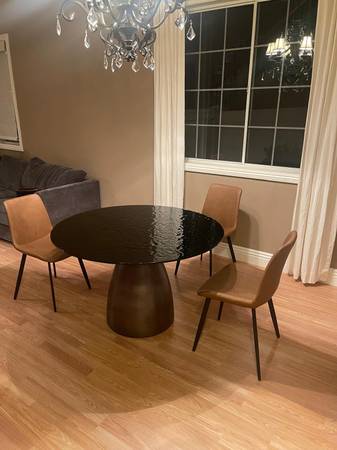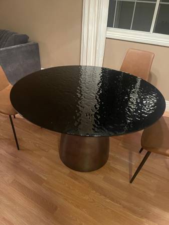 Elegant black round dining table with textured glass top and brown base. Comes with matching brown leather chairs. Modern design, seats up to 4 people comfortably.