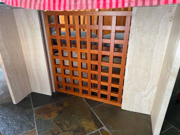 Dining set with cabinet. Table is “cracked” glass. Chairs recently recovered. Table base is travertine with natural cherrywood. Table is 42” deep X 84” wide with 6 chairs. All in excellent...