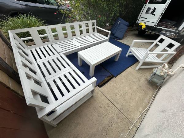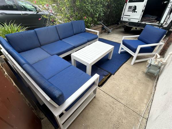 This is Pottery Barn Indio Eucalyptus 8 piece patio set and cost over 5k.Structure is in excellent condition and separates in 6 chair sections and one corner cushion seat is ripped on the bottom taped so no problems to use very comfortable includes all cushions and pillows.Save a massive bundle and kpay a small percent can deliver local if needed.One and done don’t lowball yourself out only one person gets it for the first 1175.